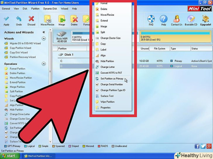Неможливо створити новий розділ із створеного нерозподіленого простору.ця помилка має місце в тому випадку, якщо на вашому жорсткому диску чотири первинних розділу. У стовпці "Тип «кожен розділ позначений або як» первинний«, або як»логічний". Якщо у вас чотири первинних розділу, то ви не зможете створити новий розділ до тих пір, поки не перетворите один первинний розділ в логічний.- Виділіть розділ, який ви хочете перетворити з первинного в логічний. Рекомендується вибрати розділ, на якому зберігаються дані. Системний розділ і розділ з даними для відновлення системи повинні бути первинними.