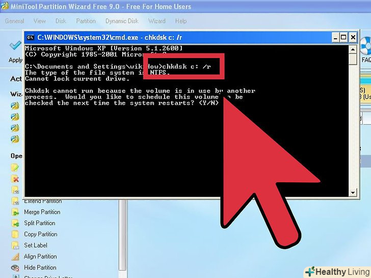 Неможливо зменшити розмір розділу за допомогою програми Partition Wizard.можливо, причина цієї помилки криється в помилках на жорсткому диску. Запустіть утиліту CHKDSK, яка перевірить стан локального диска і автоматично виправить помилки.- Натисніть «Пуск» – «командний рядок».