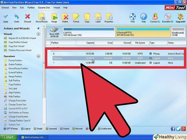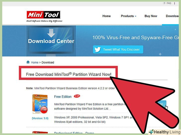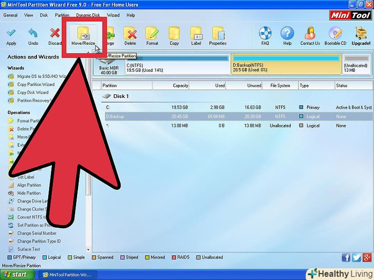 Скачайте і встановіть програму MiniTool Partition Wizard.її безкоштовна версія впорається зі зміною розміру розділу. Ця програма підтримує Windows, але ви можете скористатися будь-якою іншою аналогічною і безкоштовною утилітою.- Ви можете завантажити MiniTool Partition Wizard на сайтіpartitionwizard.com/free-partition-manager.html.
