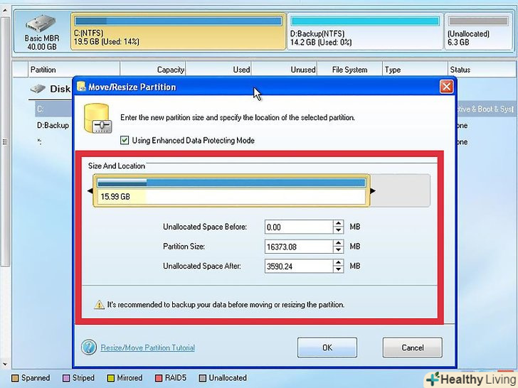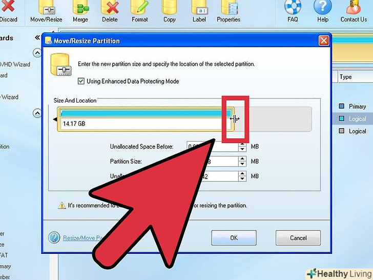 Внесіть в список завдань інші процеси.у програмі Partition Wizard ви можете внести в список завдань і інші процеси, які будуть виконані за один раз після натискання однієї кнопки. Скористайтеся цією функцією для внесення відразу декількох змін.- У нашому прикладі першим процесом буде створення нерозподіленого простору між дисками C: і D:. Виділіть диск C:, натисніть «Перемістити/змінити розмір розділу», а потім за допомогою правого повзунка додайте нерозподілений простір до системного диска. Це буде другим процесом. Таким чином, в списку завдань будуть значитися два процеси.