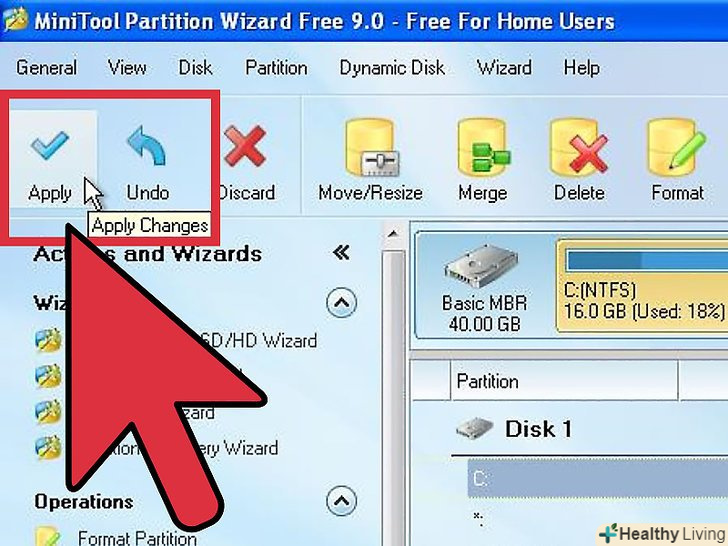 Закінчивши вносити процеси в список завдань, натисніть "Виконати" (у верхній частині вікна програми Partition Wizard).відкриється невелике вікно, в якому вам запропонують закрити всі запущені програми і створити резервну копію даних.- Розмір розділу буде негайно зменшений тільки в тому випадку, якщо цей розділ не використовується іншими програмами. На зменшення розміру розділу піде всього декількох секунд, але в разі повільного комп'ютера або великого розділу на це буде потрібно більше часу.