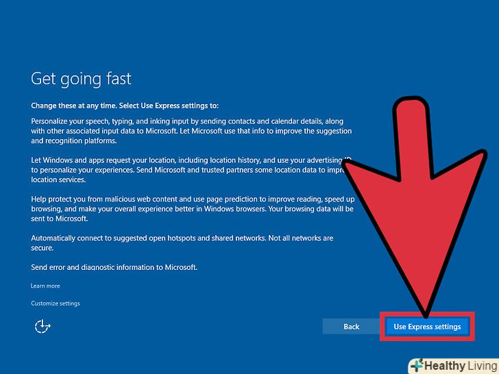 Далі вас попросять вказати свої дані і налаштувати основні параметри.після успішної установки Windows попросить вас ввести адресу електронної пошти і налаштувати параметри системи. Виконайте налаштування самостійно або виберіть Експрес-настройку, щоб використовувати параметри за замовчуванням.
