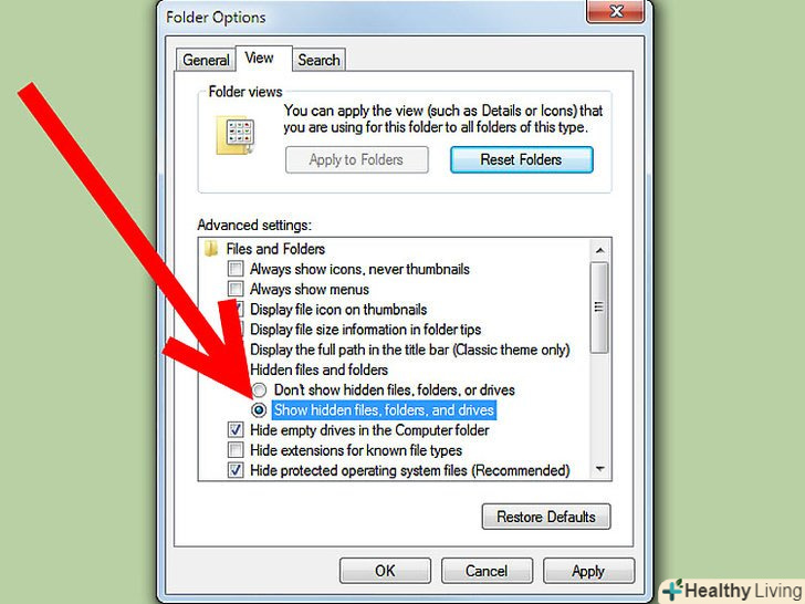 Увімкніть опцію " Показувати приховані файли і папки».ця опція знаходиться біля пункту " приховані файли і папки», внизу. Для включення опції необхідно поставити галочку навпроти потрібного варіанту (там їх два).
