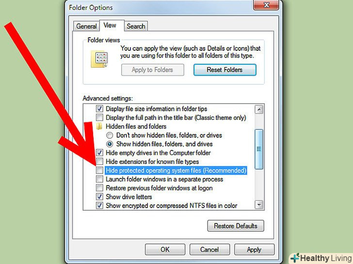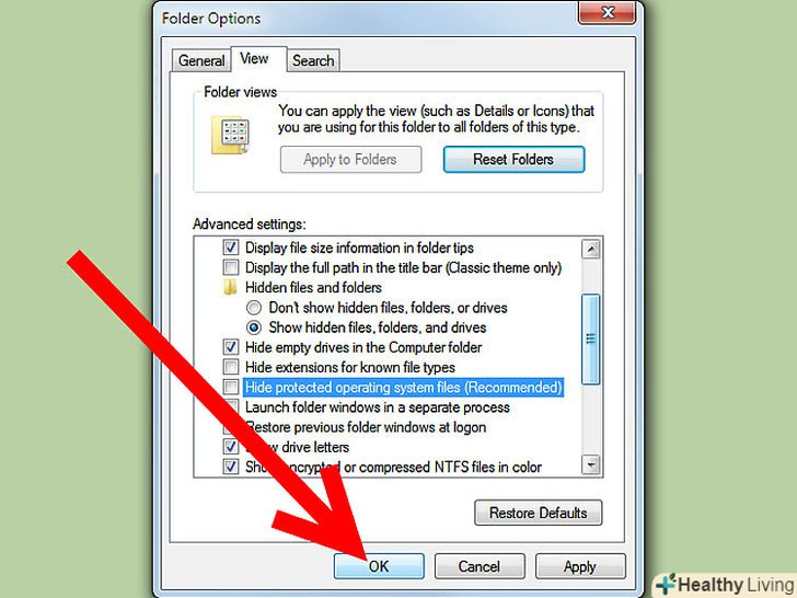Увімкніть відображення прихованих системних файлів.це можна зробити з того ж вікна, у вкладці «Додаткові налаштування». Зніміть галочку з пункту»Приховувати захищені системні файли (рекомендується)".