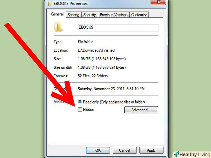 Приберіть галочку біля опції "прихований".тепер папка відкрита для загального перегляду. Для того, щоб знову заховати приховані файли і папки, зайдіть в меню «оформлення та персоналізація». Ваша папка все одно залишиться відкритою, оскільки ви прибрали галочку поруч з написом "прихований" у властивостях папки.