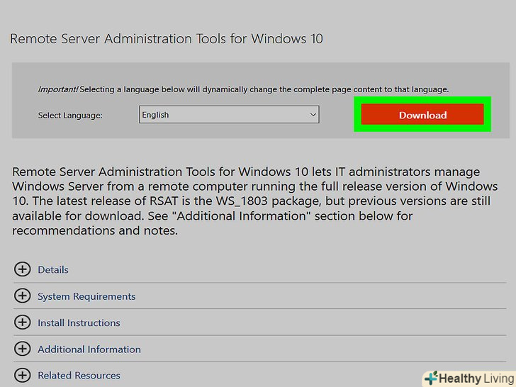 Пройдіть за цією адресою в браузері: https://www.microsoft.com/ru-RU/download/details.aspx?id=45520. оскільки активний каталог не встановлений в Windows 10 за замовчуванням, вам доведеться завантажити його з сайту Microsoft.- Якщо Ви користуєтеся іншою версією Windows, а не Windows 10 Pro або Enterprise, встановити Активний каталог не вдасться.