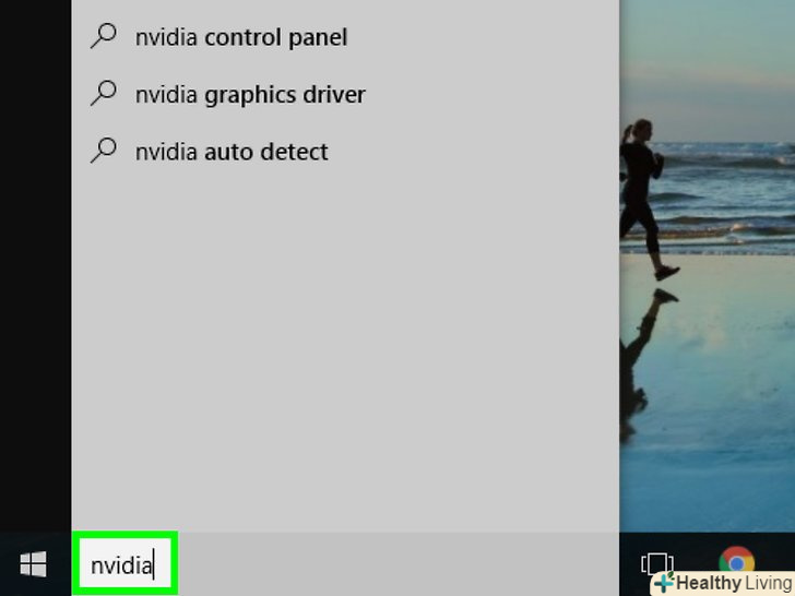 Знайдіть програму відеокарти.клацніть по рядку пошуку в нижній частині меню "Пуск", а потім введіть ім'я або модель відеокарти. Відкриється список відповідного програмного забезпечення.- Наприклад, якщо на комп'ютері встановлена відеокарта NVIDIA GeForce, в рядку пошуку введітьnvidia або geforce.