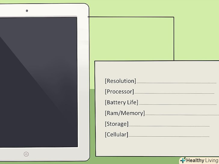 Порівняйте характеристики різних планшетів (особливо якщо ви порівнюєте планшети від різних виробників).наприклад, якщо ви хочете купити iPad, то у всіх нових моделях цього планшета встановлюється однаковий процесор. Але якщо ви хочете купити Android планшет, обов'язково Порівняйте процесори і оперативну пам'ять. [3]- Дозвіл-це розмір дисплея, виражений в кількості пікселів, що відображаються на екрані. Чим більше дозвіл, тим чіткіше зображення.