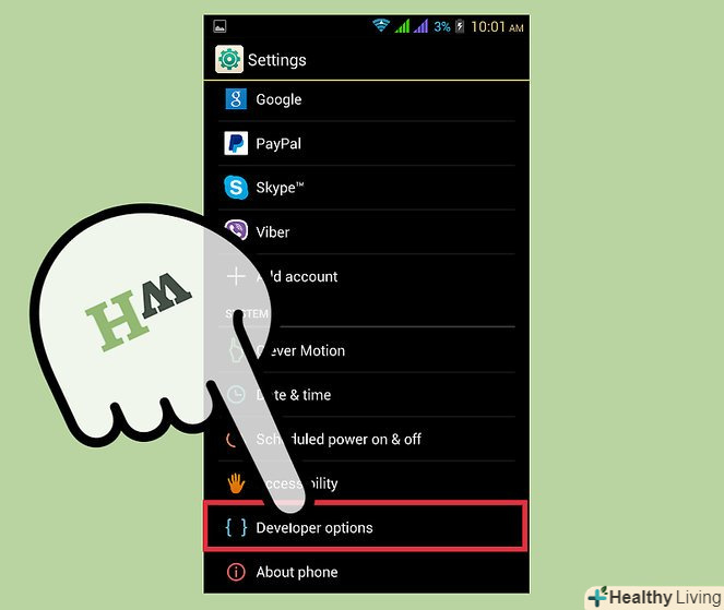 Виберіть розділ "для розробників«, потім поставте галочку поруч з параметром»Налагодження по USB".це дозволить комп'ютеру вносити зміни в Android при його підключенні через USB-порт.[1]