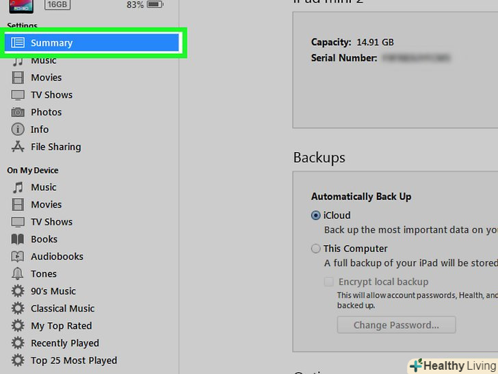 Натисніть на значок у вигляді iPad.ви знайдете його у верхньому лівому куті iTunes у випадаючому меню. Назва вашого iPad відобразиться у верхній частині лівої панелі.- Якщо ви не бачите цю піктограму, переконайтеся, що iPad увімкнено та розблоковано.[2]