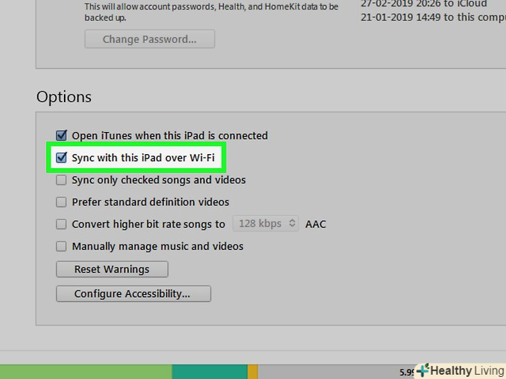 Встановіть прапорець біля " Синхронізація з iPad через Wi-Fi».ця опція знаходиться в розділі "Параметри" в нижній частині правої панелі.