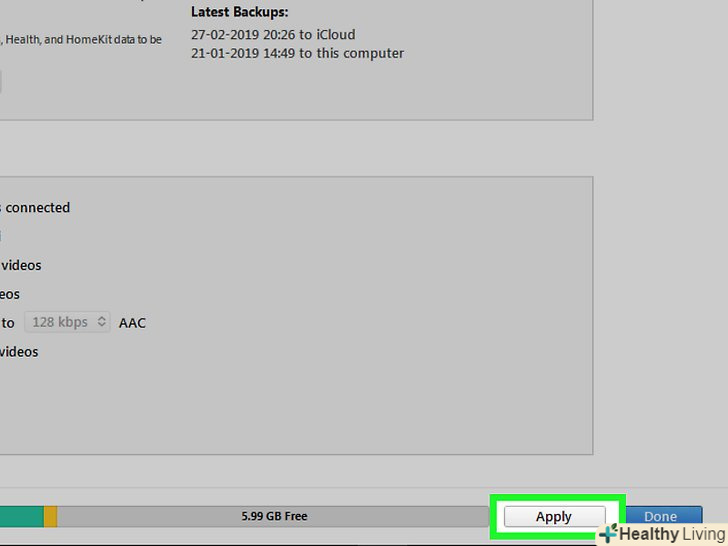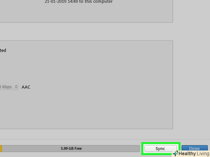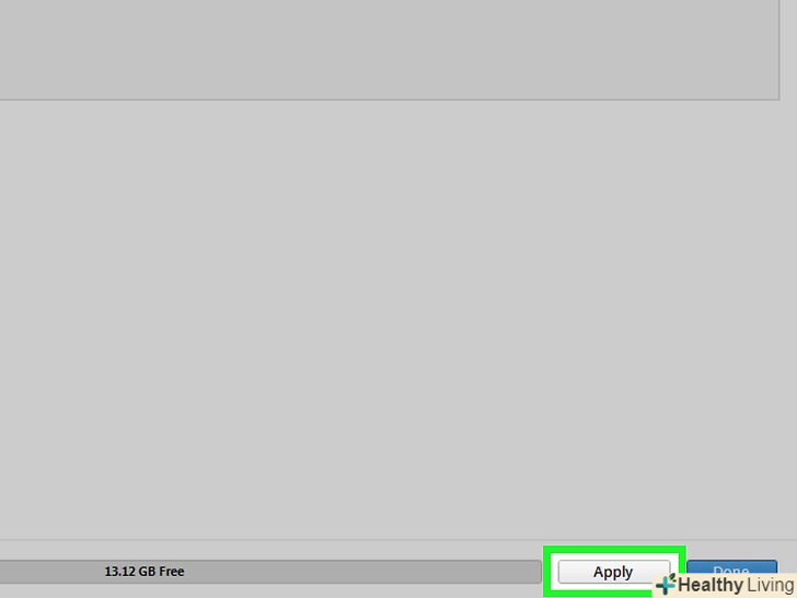 НатиснітьЗастосувати, коли зміните параметри синхронізації.ця кнопка знаходиться в правому нижньому кутку iTunes. Якщо ви не внесли жодних змін, натисніть «синхронізація» (також у правому нижньому куті).