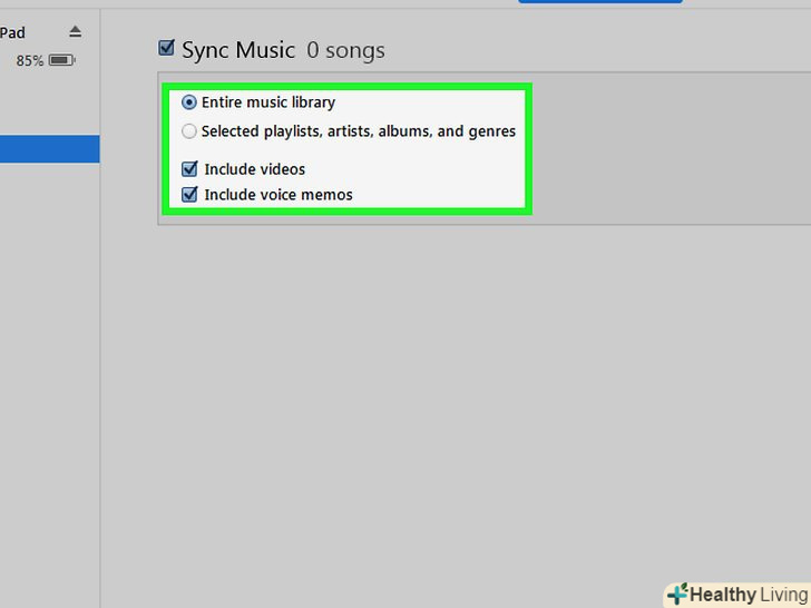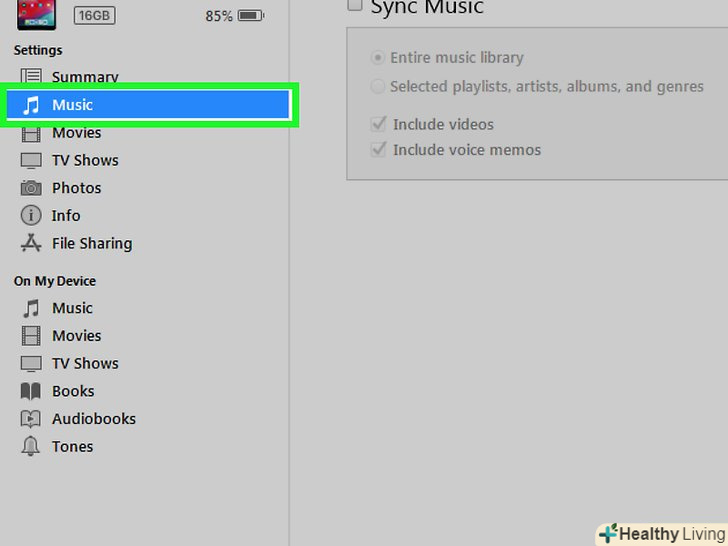 Виберіть тип вмісту, який хочете синхронізувати.типи відобразяться в розділі "Налаштування" у верхній частині лівого стовпця.- Наприклад, якщо ви хочете синхронізувати аудіофайли, натисніть «музика», щоб відкрити відповідні налаштування на головній панелі.
