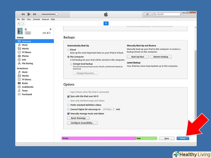 Клацніть поГотово.це Синя кнопка в нижньому правому куті вікна iTunes. Тепер до iTunes можна підключитися по бездротовій мережі, Якщо iTunes запущений на комп'ютері, а iPad підключений до тієї ж мережі, що і комп'ютер.- Деяким моделям iPad потрібен певний рівень заряду батареї, щоб підключитися до iTunes через бездротову мережу. У цьому випадку підключіть iPad до джерела живлення, наприклад, до зарядного адаптера в електророзетці.