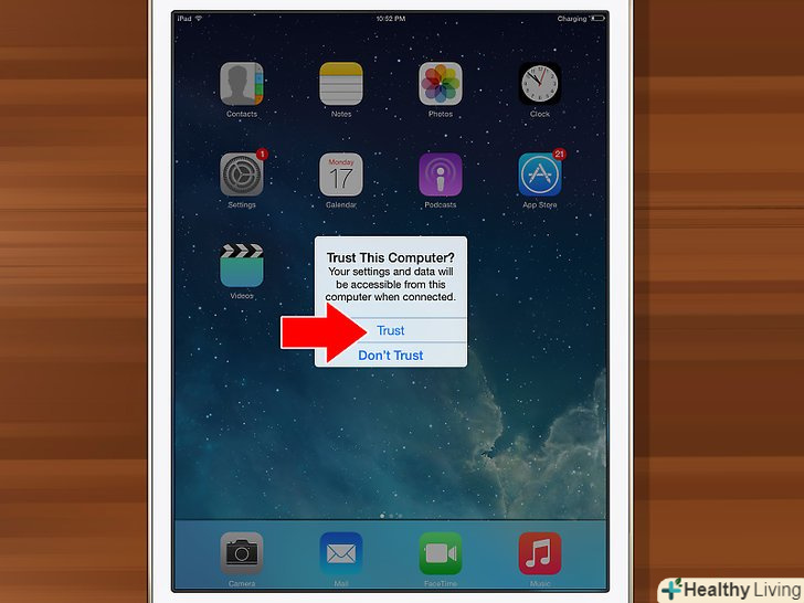 НатиснітьДовіряти на iPad.ця опція відобразиться тільки в тому випадку, якщо ви вперше підключили iPad до комп'ютера. Тепер планшет підключений до комп'ютера.- Коли на комп'ютері з'явиться запит, натисніть "Продовжити".