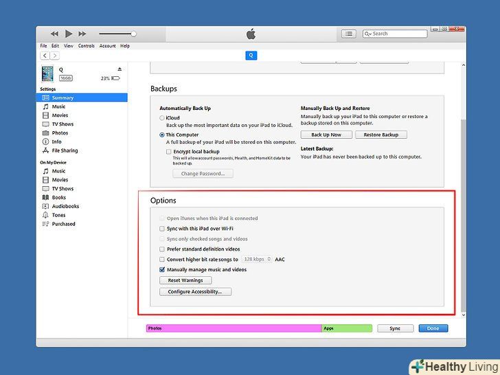 Встановіть прапорець біля " Синхронізація з iPad через Wi-Fi».ця опція знаходиться у верхній частині розділу "Параметри". Тепер iPad і iTunes на комп'ютері можуть синхронізуватися один з одним по бездротовій мережі (якщо комп'ютер і планшет підключені до однієї мережі)