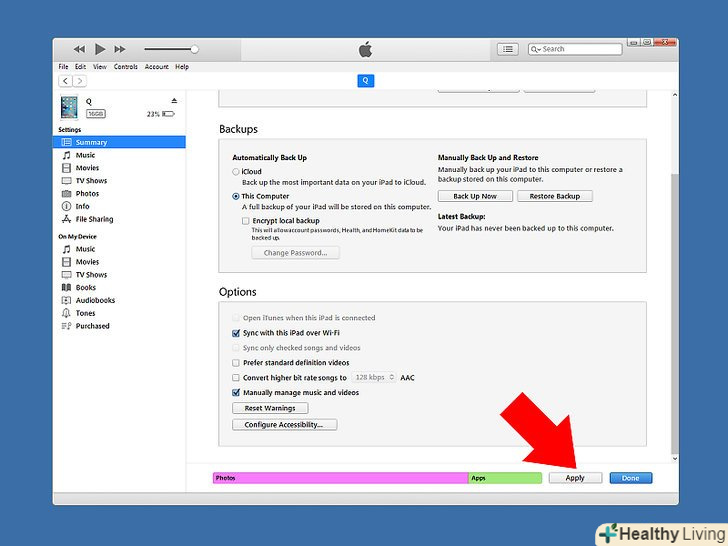 НатиснітьЗастосувати.ця сіра кнопка знаходиться в нижньому правому куті вікна iTunes. Зміни вступлять в силу.