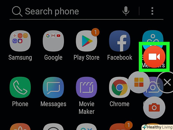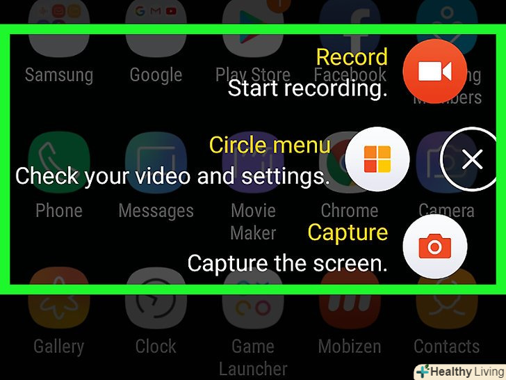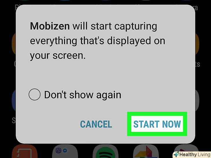 Торкніться значка запису.він виглядає як біла відеокамера на червоному тлі і знаходиться вгорі меню. Відкриється повідомлення про те, що буде зроблено запис відео з екрану.- Якщо ви вперше запустили Mobizen, натисніть «Allow» (дозволити), щоб дозволити додатку записувати відеоролики і зберігати їх в пам'яті пристрою. Потім відкриється повідомлення.