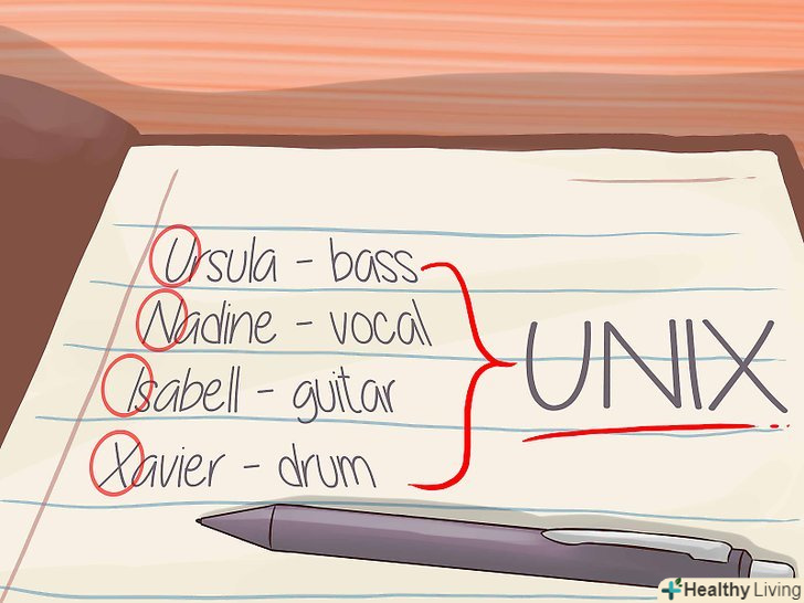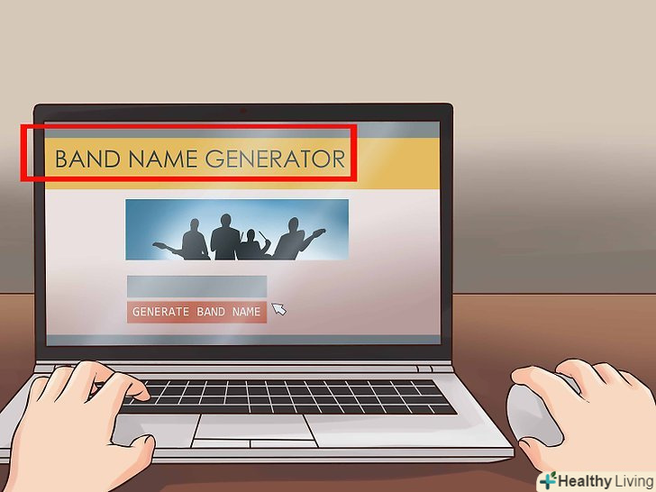 Виберіть випадкову назву. є різні методи, як можна вибрати випадкове назву. Іноді групи вибирають випадкове слово зі словника. Так зробили "REM», «The Pixies», «Incubus», «The Grateful Dead», «Evanescence»і "Outkast". "Apoptygma Berzerk" пішли по тому ж шляху, використовуючи два випадково знайдених слова.- Використовуйте Генератор назви для групи. Деякі веб-сайти можуть скласти списки з потенційними назвами для вашої групи шляхом поєднання випадково підібраних слів.[8] недоліком генератора є те, що ви не будете використовувати свої власні творчі здібності. І назва вашої групи не буде містити якогось особливого значення.