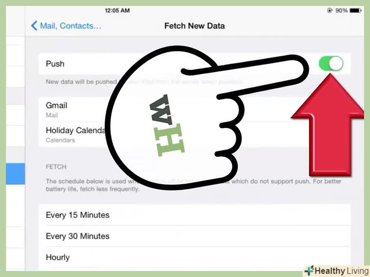 Вимкніть сповіщення про отримання даних. доцільність цього кроку залежить від кількості листів електронної пошти або IM+, які ви зазвичай отримуєте; якщо кількість листів велика, то цей крок варто використовувати, щоб уникнути виснаження батареї.- Перейдіть в " Налаштування», «пошта, адреси, календарі», "завантаження даних"("Fetch New Data"). Вимкніть цю функцію.