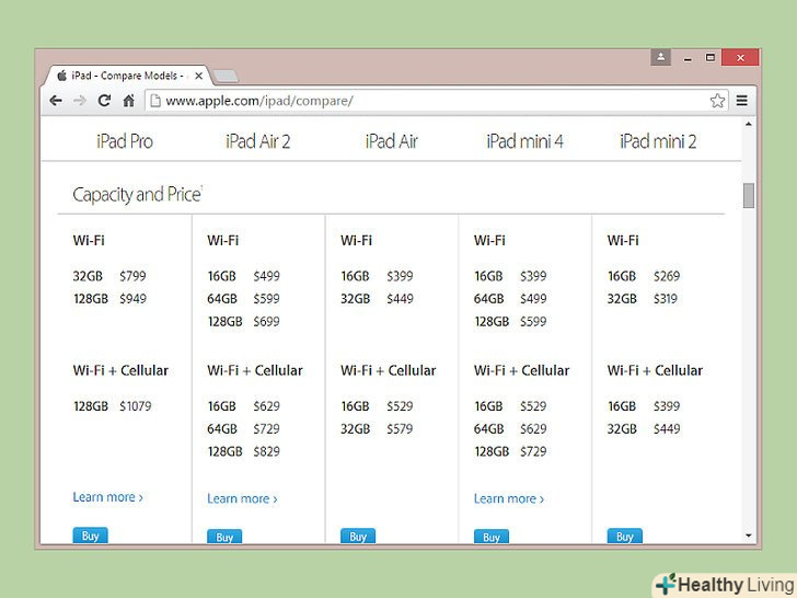 - Задумайтеся про обсяг внутрішньої пам'яті. Вибирайте модель з достатнім об'ємом пам'яті, якщо у вас велика кількість музичних файлів, відеофайлів, а також фотографій. Внутрішня пам'ять ранніх моделей iPad не перевищувала 64 ГБ, тоді як обсяг пам'яті останніх моделей iPad Air може досягати 128 ГБ (де ГБ – це гігабайт).[2]