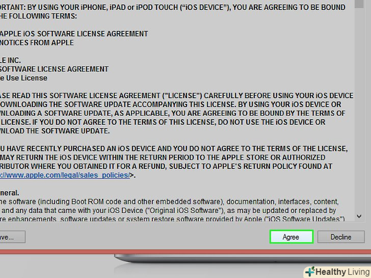 Клацніть по < span class="nowrap" title="This is not a clickable button; it illustrates the button one should find." style="font-family: Segoe UI, Frutiger, Frutiger Linotype, Dejavu Sans, Helvetica Neue, Arial, sans-serif;letter-spacing:0px;padding:0em .6em; border:1px solid; border-color:#AAA #555 #555 #AAA; -moz-border-radius: 0px; -webkit-border-radius: 0px; border-radius: 0px; background-color: #F2F2F2; background-image: -moz-linear-gradient(top, #FCFCFC, #E0E0E0); background-image: -o-linear-gradient(top, #FCFCFC, #E0E0E0); background-image: - webkit-linear-gradient(top, # FCFCFC, #E0E0E0); background-image: linear-gradient(top, #FCFCFC, #E0E0E0);">прийняти.так ви погодитеся з Умовами користування програмним забезпеченням; почнеться процес скачування і установки оновлень системи.- Коли оновлення будуть встановлені, на екрані відобразиться логотип Apple. Під час процесу оновлення не відключайте пристрій від комп'ютера.