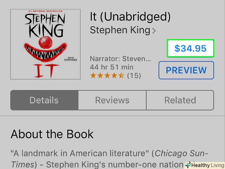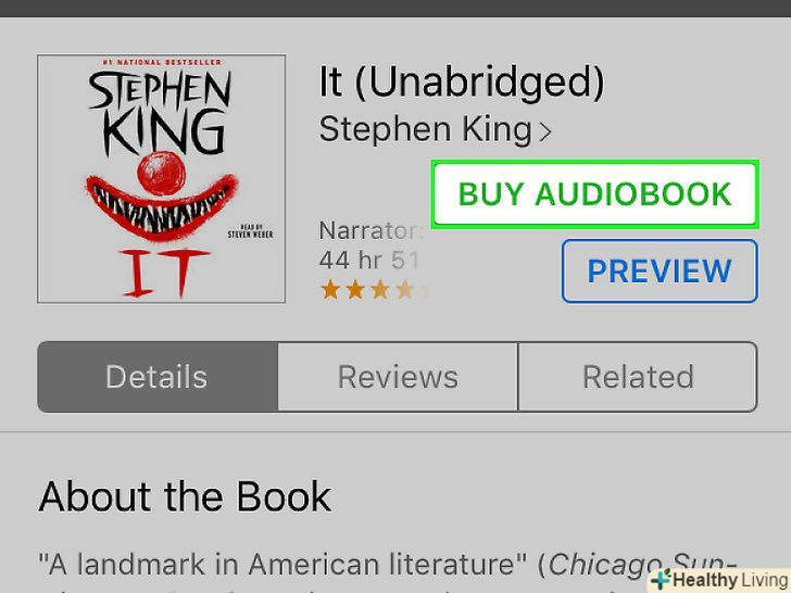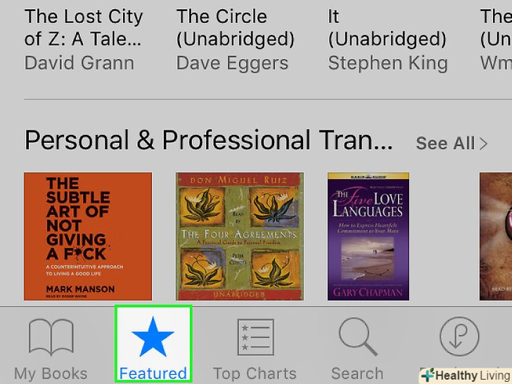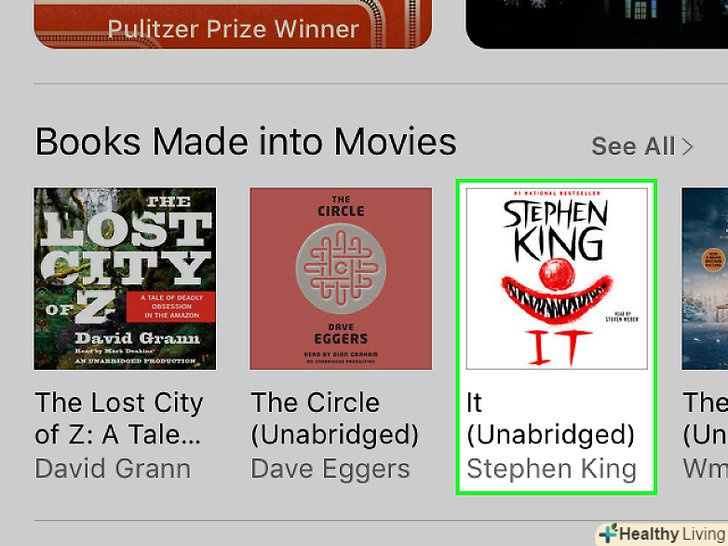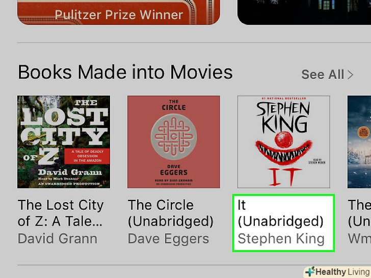Знайдіть потрібну аудіокнигу.для цього скористайтеся вкладками в нижній частині екрана:- Перейдіть на вкладку < span class="nowrap" title="This is not a clickable button; it illustrates the button one should find." style="font-family: Segoe UI, Frutiger, Frutiger Linotype, Dejavu Sans, Helvetica Neue, Arial, sans-serif;letter-spacing:0px;padding:0em .6em; border:1px solid; border-color:#AAA #555 #555 #AAA; -moz-border-radius: 0px; -webkit-border-radius: 0px; border-radius: 0px; background-color: #F2F2F2; background-image: -moz-linear-gradient(top, #FCFCFC, #E0E0E0); background-image: -o-linear-gradient(top, #FCFCFC, #E0E0E0); background-image:-webkit-linear-gradient(top, #FCFCFC, #E0E0E0); background-image: linear-gradient(top, #FCFCFC, #E0E0E0);">Добірка, на якій представлені нові аудіокниги і книги, рекомендовані компанією Apple.