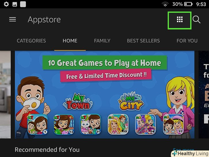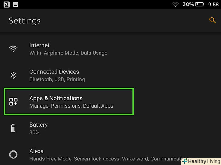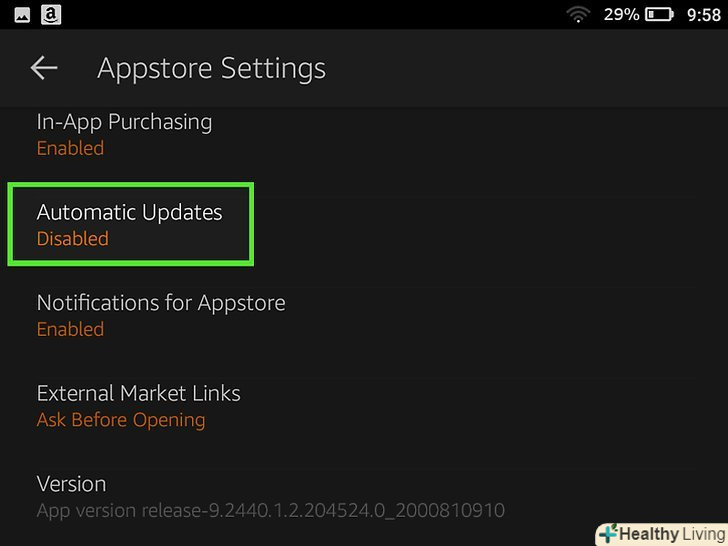 Торкніться значка " Settings "(Налаштування), щоб перейти до налаштувань Kindle.іконка Налаштувань має вигляд сірої шестерінки і знаходиться на робочому столі. Якщо ви включите автоматичне оновлення для кожної програми, вам не доведеться оновлювати їх вручну, до того ж версія додатків завжди буде актуальною.