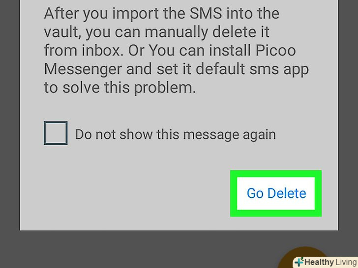НатиснітьGo Delete (Видалити) у вікні.у вікні буде сказано, що Vault не видаляє приховані повідомлення з програми для їх обміну, тому Ви повинні зробити це вручну. Запуститься додаток для обміну SMS-повідомленнями.- Якщо таке вікно не відкрилося, просто запустіть програму для обміну SMS-повідомленнями.