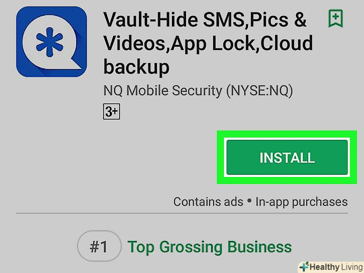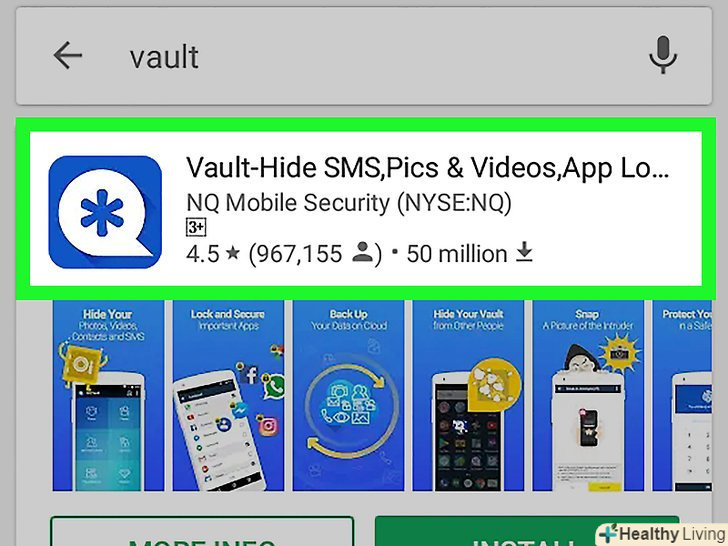 ТоркнітьсяVault — Приховування картинок і відео, рундук. Значок цього додатка має вигляд білої мовної хмари на синьому тлі з синім символом"*".- Додаток розроблений компанією NQ Mobile Security.