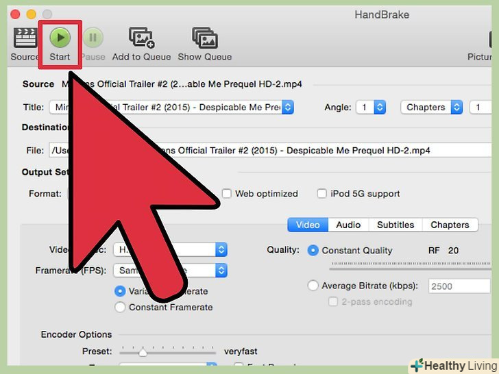 - Натисніть "Запустити", щоб почати конвертування фільму. Це займе деякий час. За ходом виконання процесу можна стежити в нижній частині вікна Handbrake.