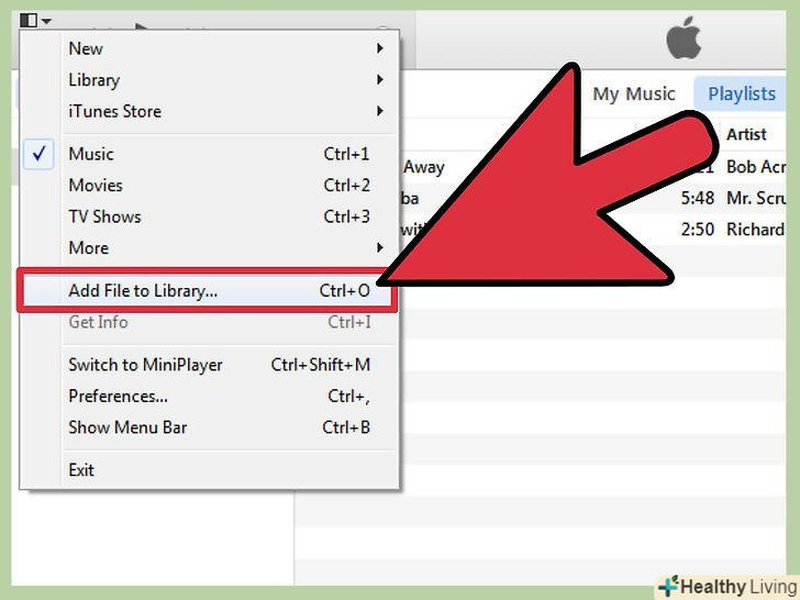 Додайте фільм в медіатеку iTunes.так ви отримаєте можливість синхронізувати його з вашим iPad.- Натисніть " Файл "(Windows) або відкрийте меню iTunes (Mac OS) і виберіть «Додати файл в медіатеку». Знайдіть файл фільму, який ви тільки що скопіювали з диска і конвертували в потрібний формат.