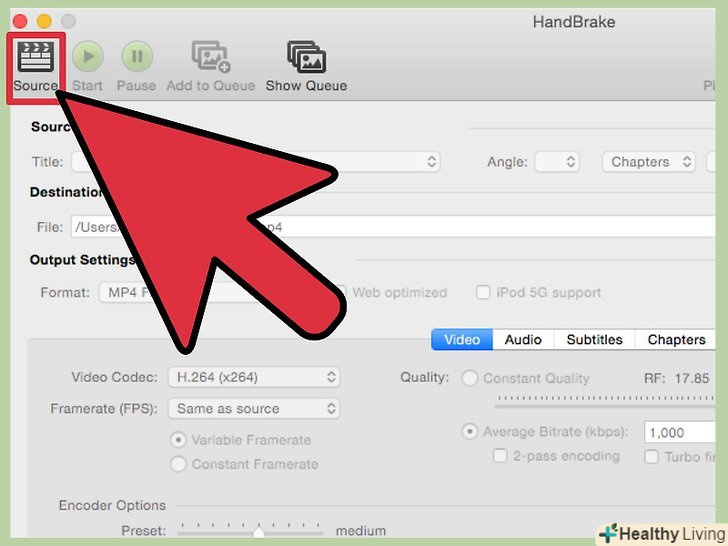 - Запустіть Handbrake і натисніть "джерело". Виберіть завантажений відеофайл на комп'ютері.
