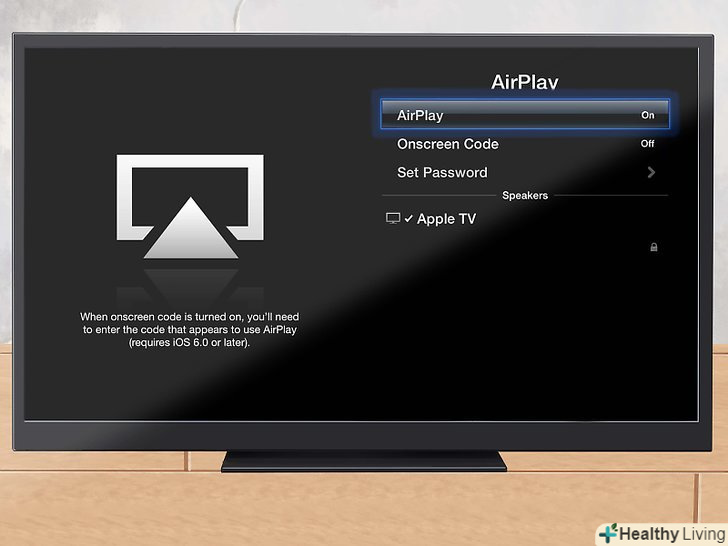 Увімкніть Ваш телевізор і пристрій Apple TV.Підключіть Apple TV до вашого телевізора через спеціальний вхід. Ви повинні побачити інтерфейс Apple TV на екрані.- Перевірте налаштування в меню Apple TV і переконайтеся, що функція AirPlay включена.