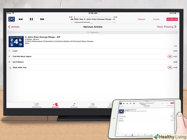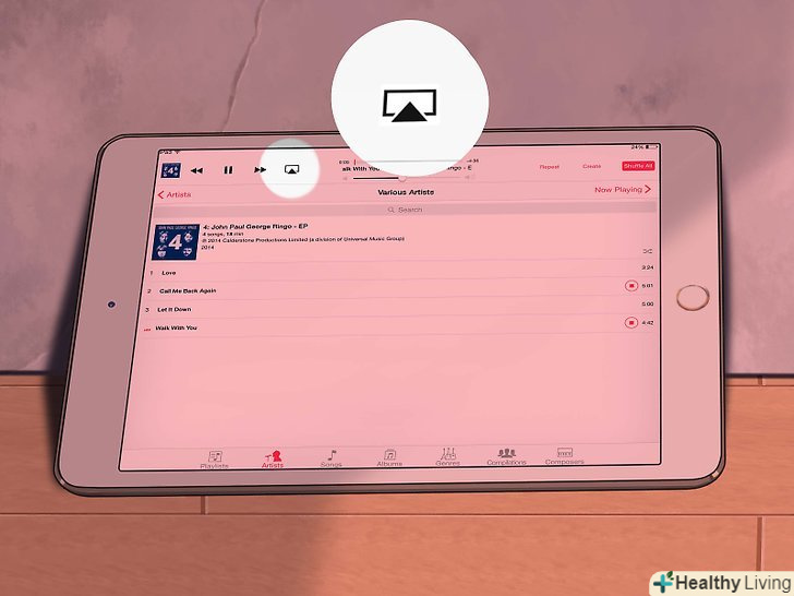Почніть трансляцію.щоб почати трансляцію контенту на телевізор, запустіть вибраний медіа-файл на вашому iPad і торкніться кнопки AirPlay. Ця кнопка знаходиться поруч з кнопкою " Далі» ("Next") на панелі регулювання яскравості і гучності. Натискаючи на цю кнопку, ви відправляєте відео або музичний потік на екран Apple TV.[2]- Коли контент транслюється на екран телевізора, ви можете регулювати яскравість, гучність і інші настройки з екрану вашого iPad, ви можете почати, зупинити, пропустити, поставити на паузу обраний трек. Якщо ви транслюєте картинки, ви можете гортати їх на екрані iPad, щоб продовжувати показ.