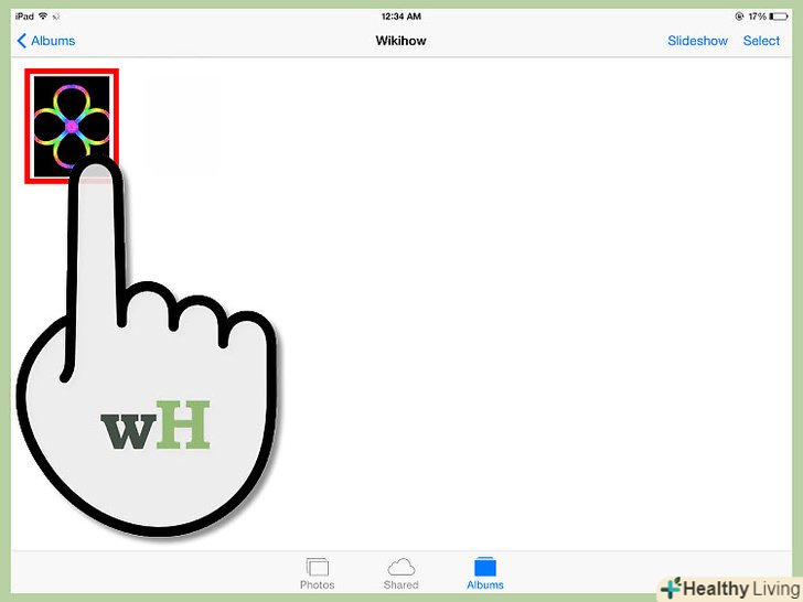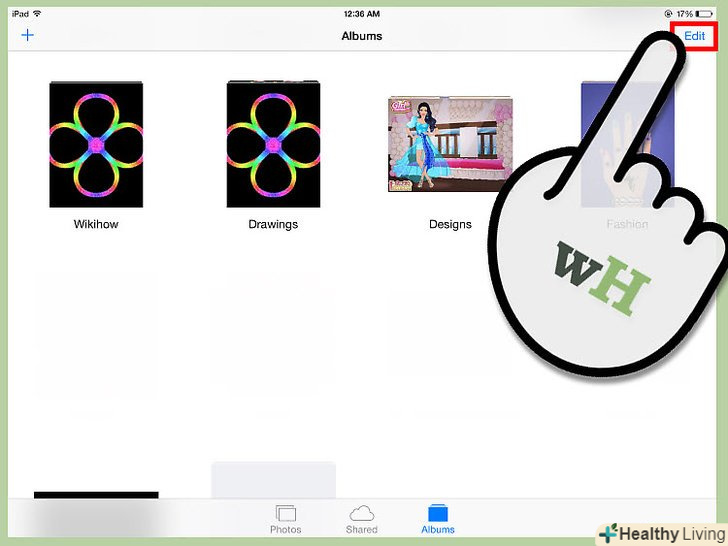 Видаляємо альбом.ви можете видалити будь-який створений вами альбом. Однак, ви не зможете видалити звідти фотографії, синхронізовані з вашим комп'ютером (див.наступний розділ).- Натисніть на значок "Альбом" на головному екрані свого iPad, щоб запустити додаток з фотографіями. Натисніть кнопку "Редагувати" у верхньому правому куті екрана альбомів. Натисніть на "X", який з'явиться у верхньому лівому куті альбому, який ви хочете видалити.