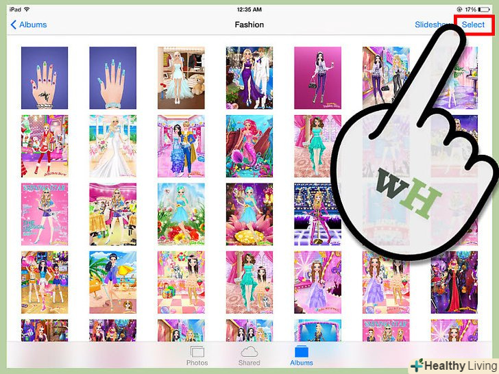 Видаляємо кілька фотографій.натисніть на значок "Альбом" на головному екрані свого iPad, щоб запустити додаток з фотографіями, потім натисніть кнопку Select у верхньому правому куті. Ви зможете видалити всі вибрані вами фотографії.- Як тільки ви вибрали фотографії, що підлягають видаленню, натисніть на червону кнопку "Видалити" у верхньому лівому кутку екрану. Тепер натисніть кнопку "Видалити вибрані зображення" з меню, що з'явилося.