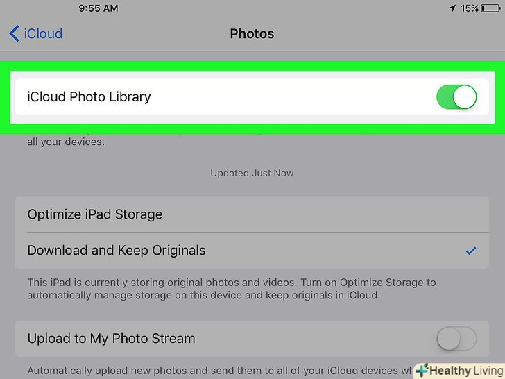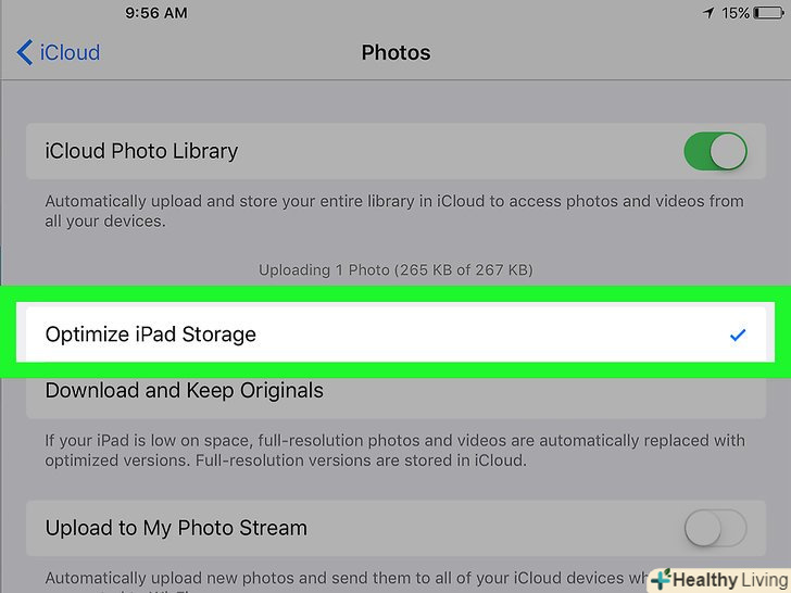 ICloud Photo Library-це програма, що дозволяє автоматично завантажувати і зберігати всі ваші фотографії на вашому iCloud Drive, що робить їх доступними з будь-якого пристрою. це означає, що кожен пристрій, в якому включена програма iCloud Photo Library, буде завантажувати і зберігати копію кожної фотографії в пам'яті пристрою.- Для економії пам'яті вашого iPad при використанні iCloud Photo Library ви можете налаштувати програму так, щоб завантажувати в пам'ять iPad тільки зменшені версії зображень, а оригінальні версії зберігати в вашому iCloud Drive.