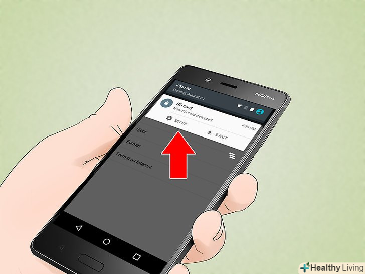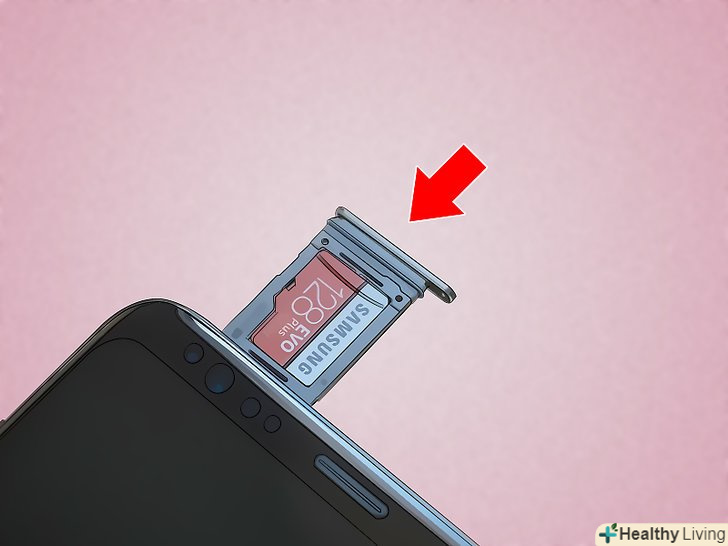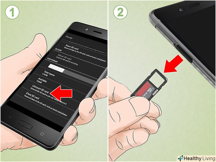 Вийміть SD-карту з слота для карт пам'яті вашого пристрою.у розділі "Пам'ять" натисніть "витягти SD-карту". Дочекайтеся відображення на екрані повідомлення про те, що карту пам'яті можна витягти. Повільно витягніть карту пам'яті з слота, щоб не пошкодити її.[13]
