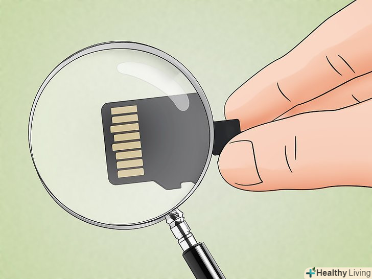Огляньте карту на предмет будь-яких пошкоджень, які можуть перешкоджати розпізнаванню карти пристроєм.можливо, відсутній один з контактів (золотого кольору) або на карті є тріщини або вм'ятини. Якщо карта пам'яті пошкоджена, замініть її на іншу SD-карту, яку можна недорого купити в будь-якому магазині електроніки.[14]