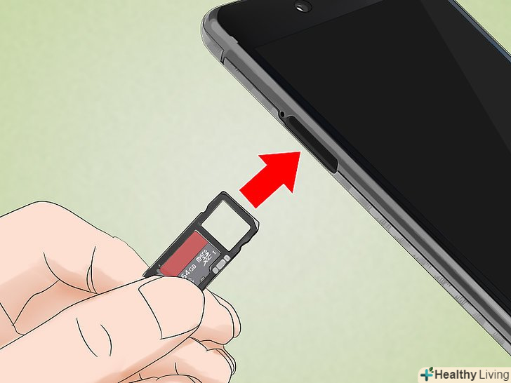 Вставте microSD-карту у відповідний слот для карт пам'яті вашого Android-пристрою.перед цим зарядіть батарею пристрою і вимкніть його. Повільно вставляйте карту до тих пір, поки не почуєте клацання. Якщо ви не можете знайти слот для карт пам'яті, почитайте Керівництво по експлуатації пристрою або зв'яжіться з його виробником.[1]