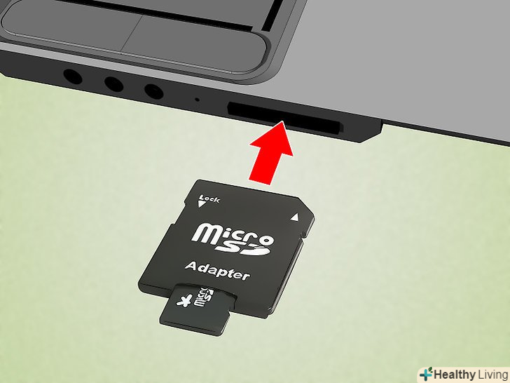Вставте SD-карту в слот для карт пам'яті. цей слот, як правило, розташований зліва. Перед цим зарядіть батарею пристрою. Повільно вставляйте карту до тих пір, поки не почуєте клацання. Якщо ви не можете знайти слот для карт пам'яті, почитайте Керівництво по експлуатації пристрою або зв'яжіться з його виробником.[5]