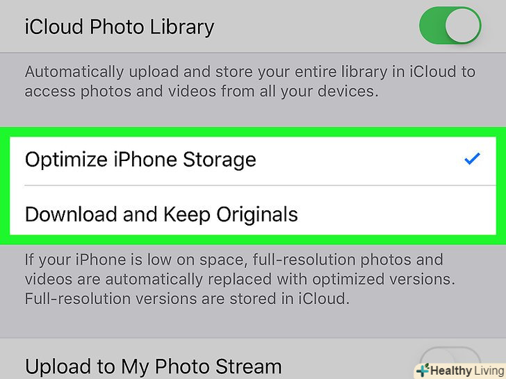 Виберіть спосіб зберігання фотографій на iPhone / iPad.- Якщо вибрати "оптимізувати сховище", фото і відео на пристрої будуть замінені їх оптимізованими версіями (з меншою роздільною здатністю). Версії з повною роздільною здатністю будуть зберігатися в iCloud.
