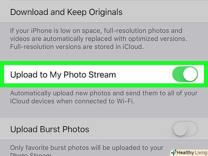 Пересуньте повзунок уЗавантажити в мій фотопотік в положення<.відтепер всі нові фото і відео будуть автоматично завантажуватися в iCloud (якщо пристрій підключено до бездротової мережі).