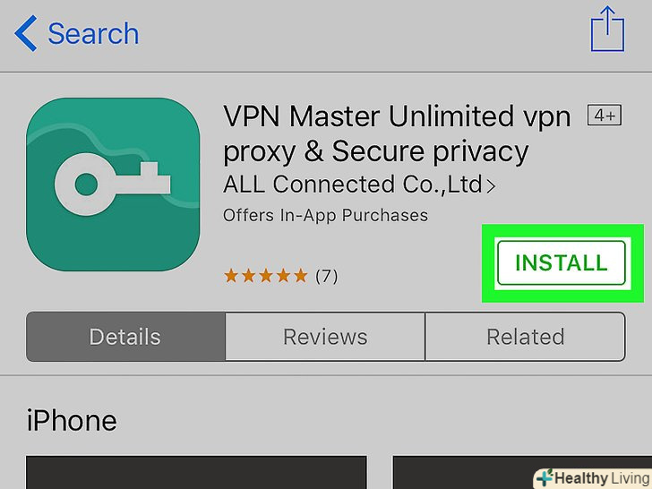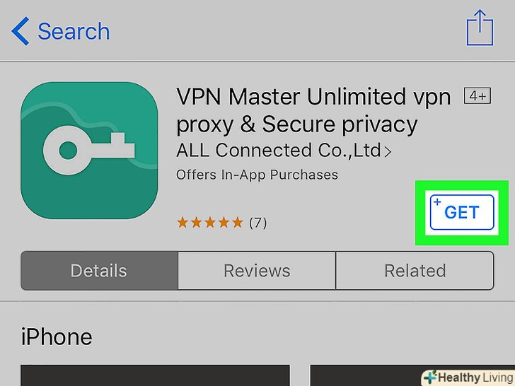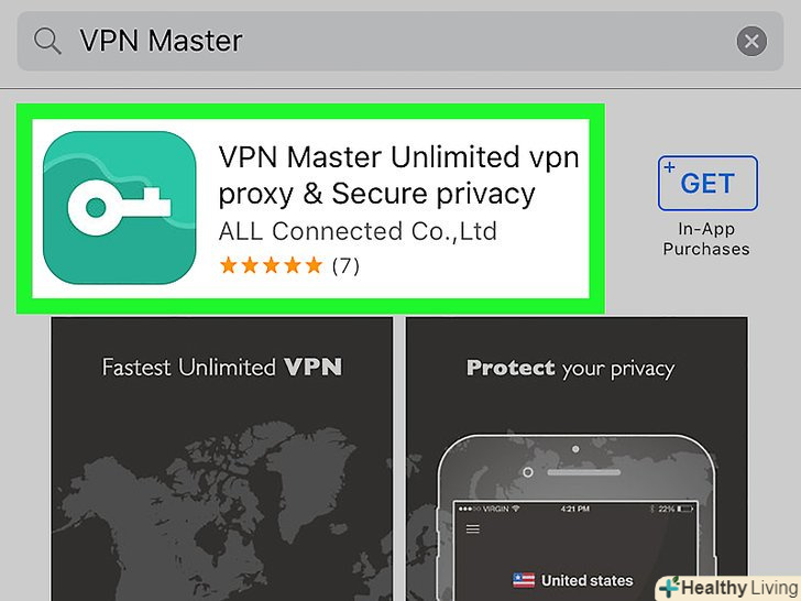 Торкніться < span class="nowrap" title="This is not a clickable button; it illustrates the button one should find." style="font-family: Segoe UI, Frutiger, Frutiger Linotype, Dejavu Sans, Helvetica Neue, Arial, sans-serif;letter-spacing:0px;padding:0em .6em; border:1px solid; border-color:#AAA #555 #555 #AAA; -moz-border-radius: 0px; -webkit-border-radius: 0px; border-radius: 0px; background-color: #F2F2F2; background-image: -moz-linear-gradient(top, #FCFCFC, #E0E0E0); background-image: -o-linear-gradient(top, #FCFCFC, #E0E0E0); background-image:-webkit-linear-gradient(top, #FCFCFC, #E0E0E0); background-image: linear-gradient(top, #FCFCFC, #E0E0E0); " >VPN Master в результатах пошуку, щоб перейти на сторінку програми. потрібне вам додаток має зелений значок з ключем.