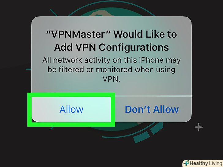 Торкніться < span class="nowrap" title="This is not a clickable button; it illustrates the button one should find." style="font-family: Segoe UI, Frutiger, Frutiger Linotype, Dejavu Sans, Helvetica Neue, Arial, sans-serif;letter-spacing:0px;padding:0em .6em; border:1px solid; border-color:#AAA #555 #555 #AAA; -moz-border-radius: 0px; -webkit-border-radius: 0px; border-radius: 0px; background-color: #F2F2F2; background-image: -moz-linear-gradient(top, #FCFCFC, #E0E0E0); background-image: -o-linear-gradient(top, #FCFCFC, #E0E0E0); background-image:-webkit-linear-gradient(top, #FCFCFC, #E0E0E0); background-image: linear-gradient (top, #FCFCFC, #E0E0E0); " >дозволити, щоб дозволити додатку пропускати інтернет-трафік через VPN.після цього на екрані VPN перемикач "Статус «перейде в положення" Вкл."(стане зеленим).- Перш ніж продовжити, вас можуть попросити ввести пароль або надати відбиток пальця.