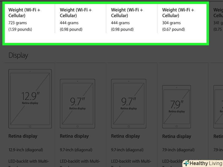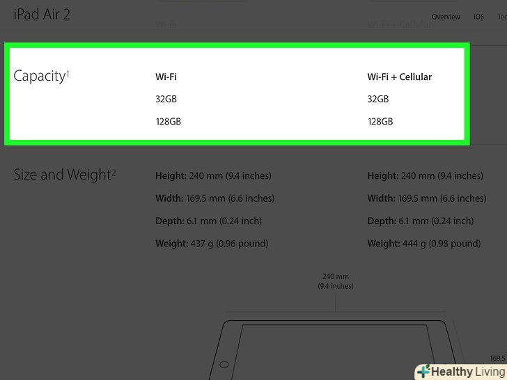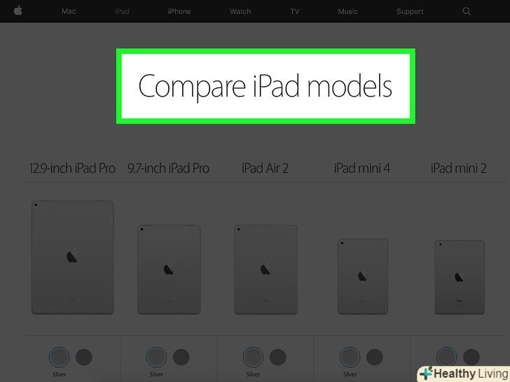 Подумайте, яким повинен бути ваш ідеальний iPad.більшість iPad мають пам'ять від 16 до 128 гігабайт (хоча деякі моделі, такі як iPad Pro, підтримують до 256 гігабайт). Крім того, більшість iPad, представлених на ринку, підтримують Стільникові дані, тобто ви можете підключити свій iPad до тарифного плану оператора стільникового зв'язку і користуватися нею для виходу в інтернет там, де немає доступу до Wi-Fi. До інших аспектів, які ви напевно будете враховувати, відносяться:- -різні моделі iPad мають діагональ екрану від 7,9 дюйма до 12,9 дюйма.