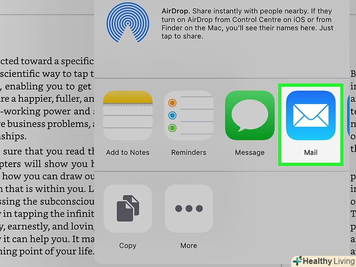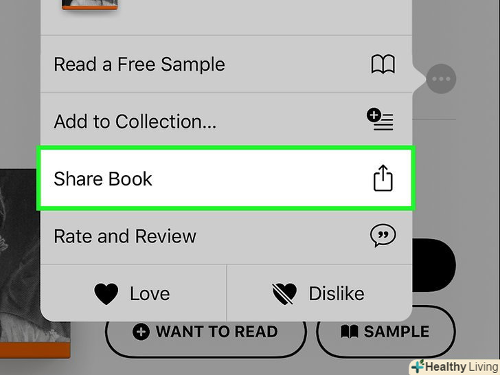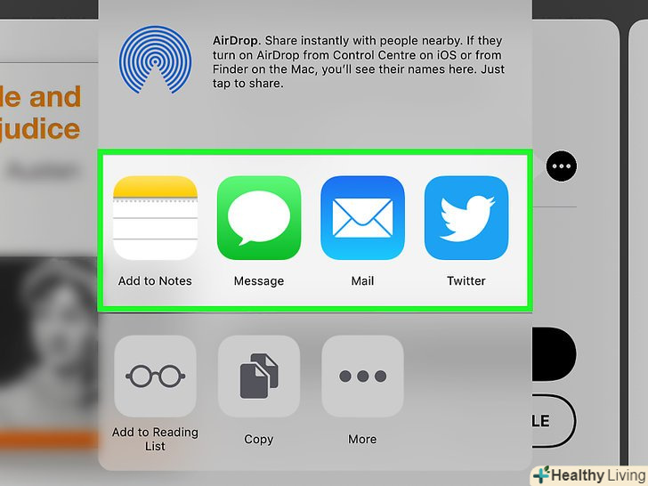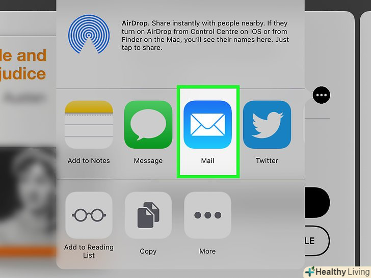 Виберіть спосіб обміну книгою.прокрутіть ліворуч, щоб переглянути всі способи, такі як електронна пошта, текстове повідомлення, AirDrop або соціальні мережі. Натисніть кнопку, щоб вибрати спосіб.- Адресат отримає посилання на електронну книгу, куплену в iTunes Store.