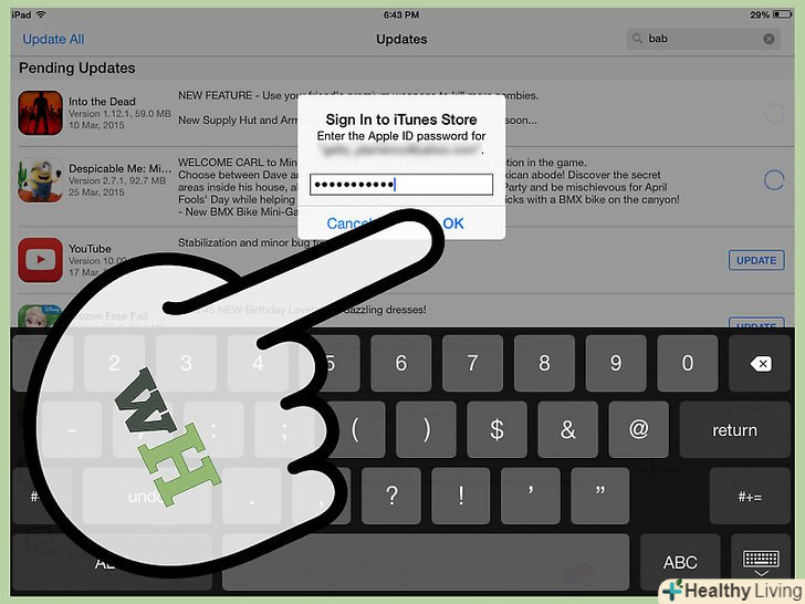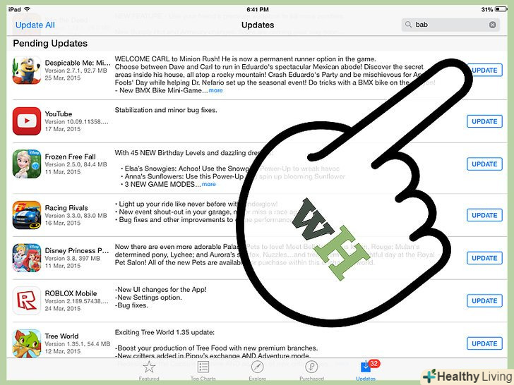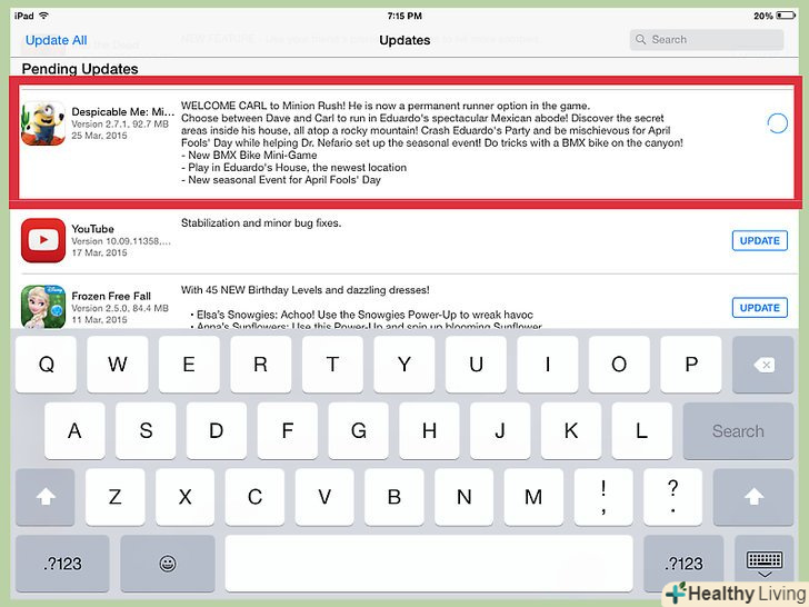 Натисніть на вкладку " Updates "(оновлення), щоб побачити всі доступні оновлення для додатків, встановлених на вашому iPad. кожне перерахування оновлення має на увазі, що воно набуде чинності після завантаження. Тепер клікніть по кнопці "Update" (Оновити).