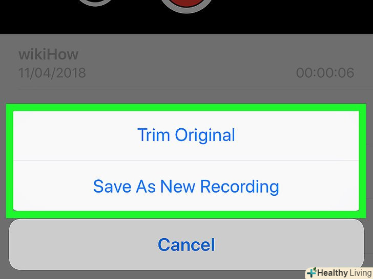 ТоркнітьсяОбрізати оригінал або Зберегти як новий запис.якщо вибрати першу опцію, вихідний файл буде перезаписаний. Якщо торкнутися другої опції, буде створено новий файл, а оригінал не постраждає.